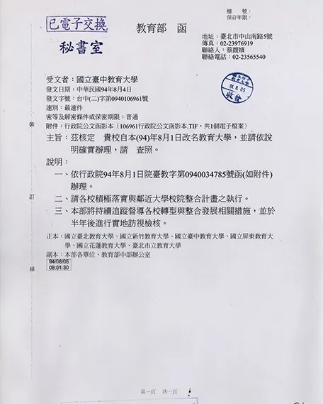 | 案由 | 茲核定 貴校自本 (94) 年 8 月 1 日改名教育大學, 並請依說明確實辦理 |